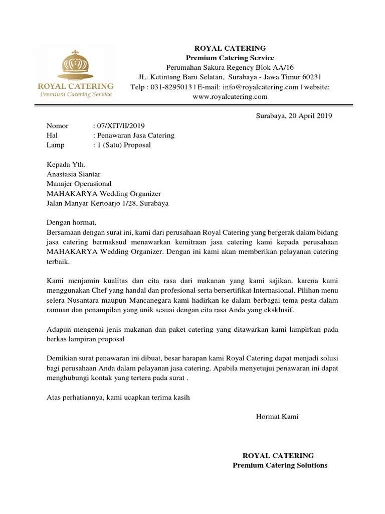 11 contoh surat penawaran barang jasa kerjasama pesanan. Proposal catering yang berisikan mengenai pilihan menu dan harga. Daftar menu yang ada pada kami adalah contoh, jika anda . Contoh surat penawaran barang ke perusahaan. Kami berharap semoga pembahasan mengenai contoh proposal penawaran kerjasama catering dengan perusahaan berikut ini bermanfaat untuk anda.